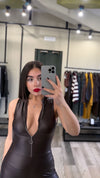 Il JUMPSUIT ELETTRA BROWN è realizzato in ecopelle, garantendo un look trendy e rispettoso dell'ambiente. La sua vestibilità elasticizzata si adatta a taglie fino alla 44 e la presenza di una zip centrale facilita l'indossamento. Un capo versatile e comodo, perfetto per qualsiasi occasione.